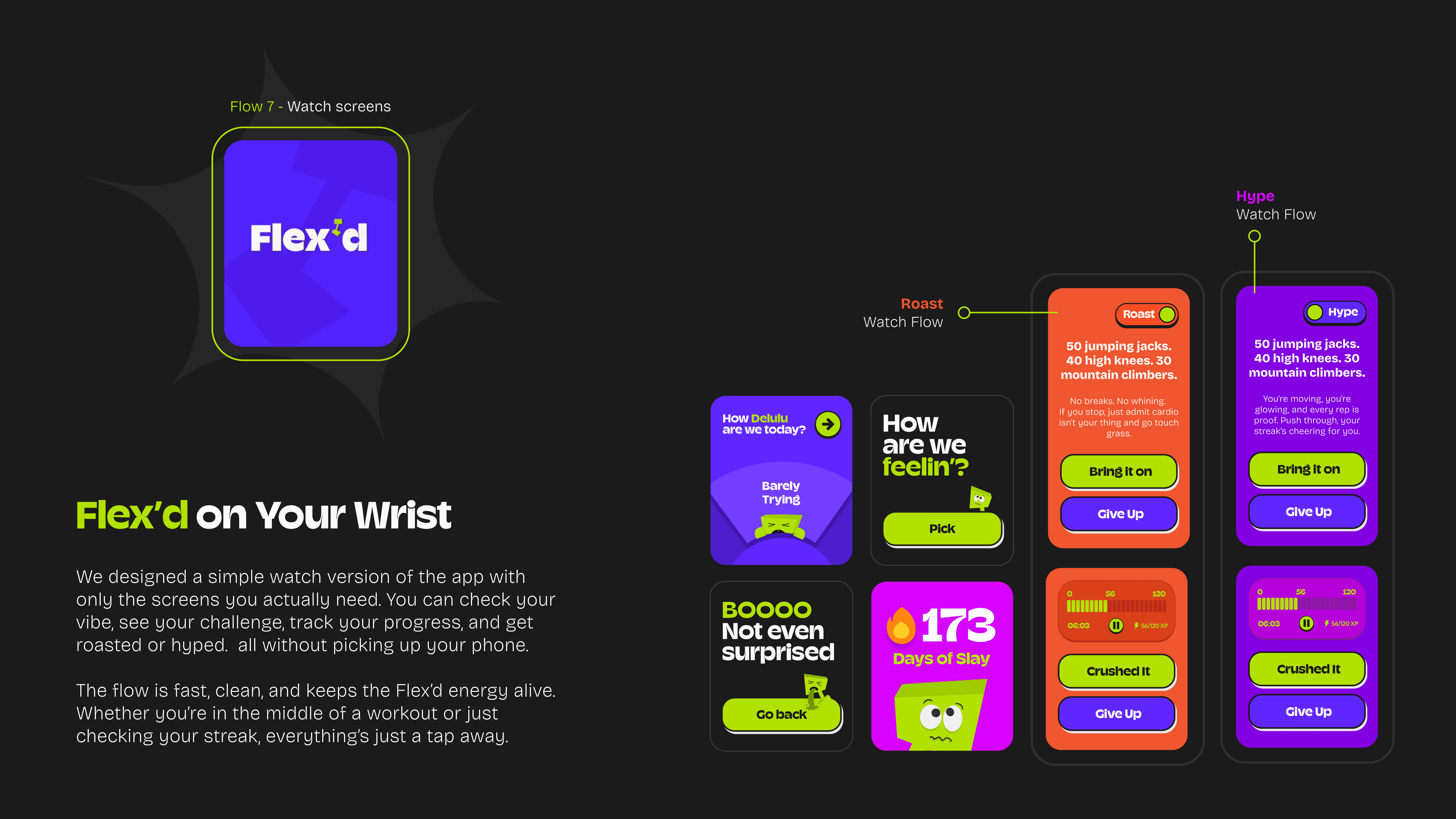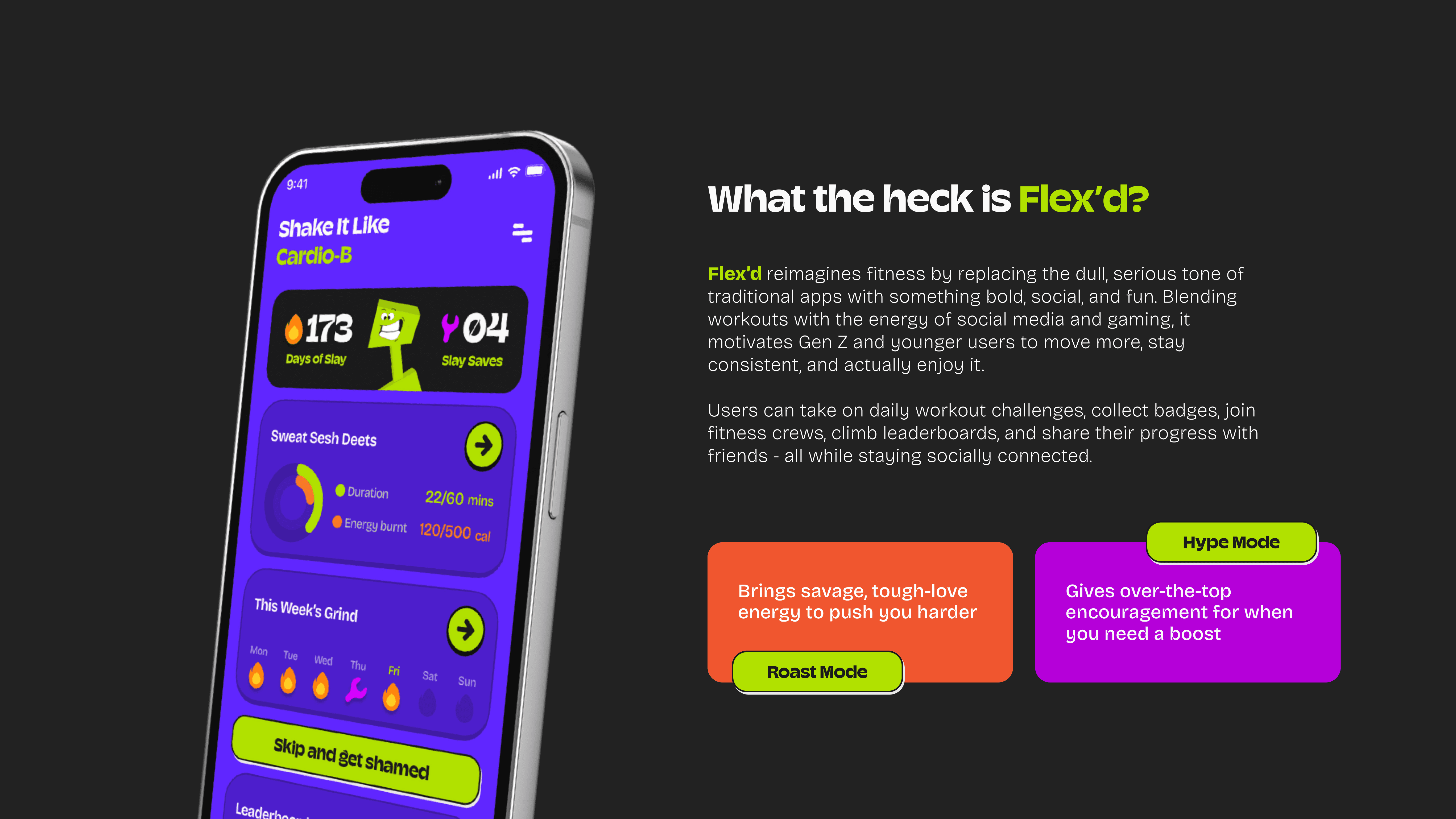 Flex’d is a visual concept fitness project I co-led as part of a class in Spring 2025. The goal was to explore a bold, expressive design direction that intentionally moves away from the calm, minimal tone most fitness apps rely on.