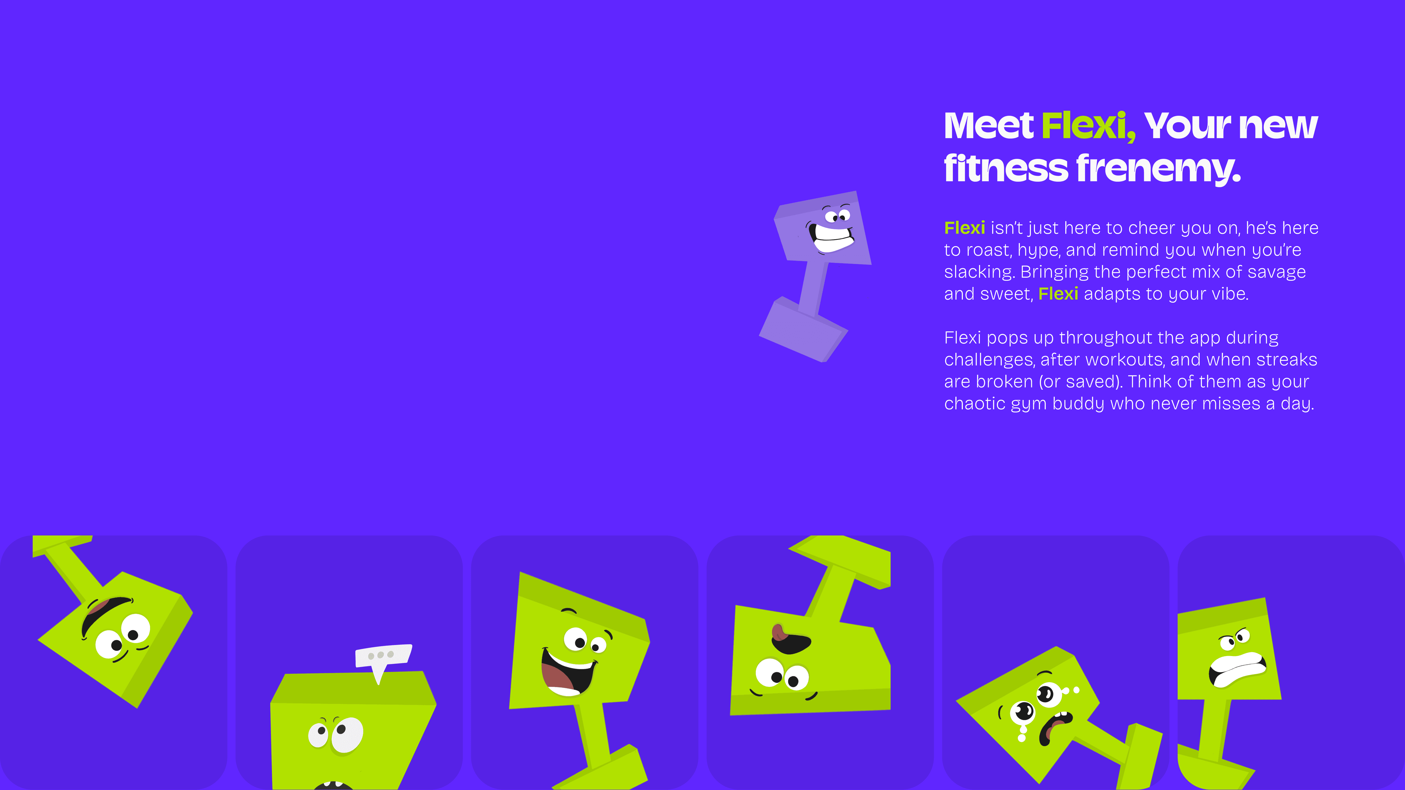 The project leans into a brutalist aesthetic, loud color, strong typography, and personality-driven interactions to make fitness feel more playful and social. This work is intentionally experimental and focuses on visual craft, interaction style, and system consistency rather than real-world constraints or metrics.
